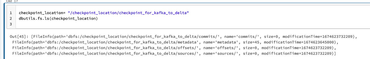 dbutils.fs.ls(f”{checkpoint_location}/commits”)/checkpoint_location/checkpoint_for_kafka_to_delta/commits/0