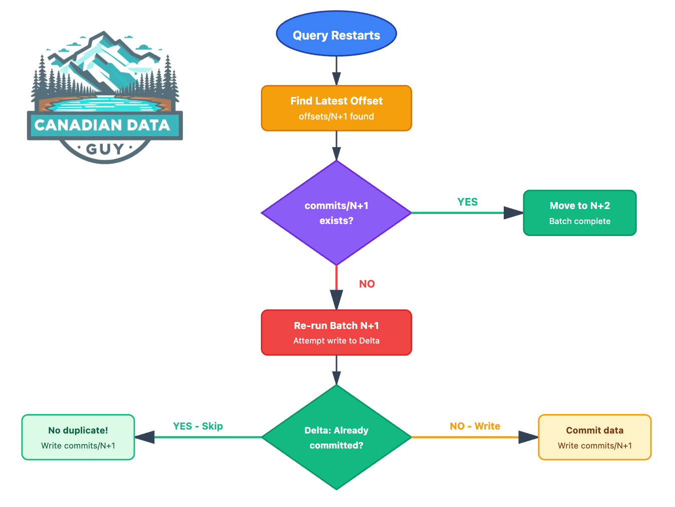 Batch N+1 was successfully written to Delta Lake, but the commit file was never created. On restart, Spark will see: