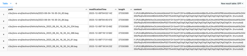 process_rosbag_udf = udf(extract_rosbag_data, returnType=rosbag_schema)Now let’s test if Autoloader & Parsing if custom UDF is working using the display command.